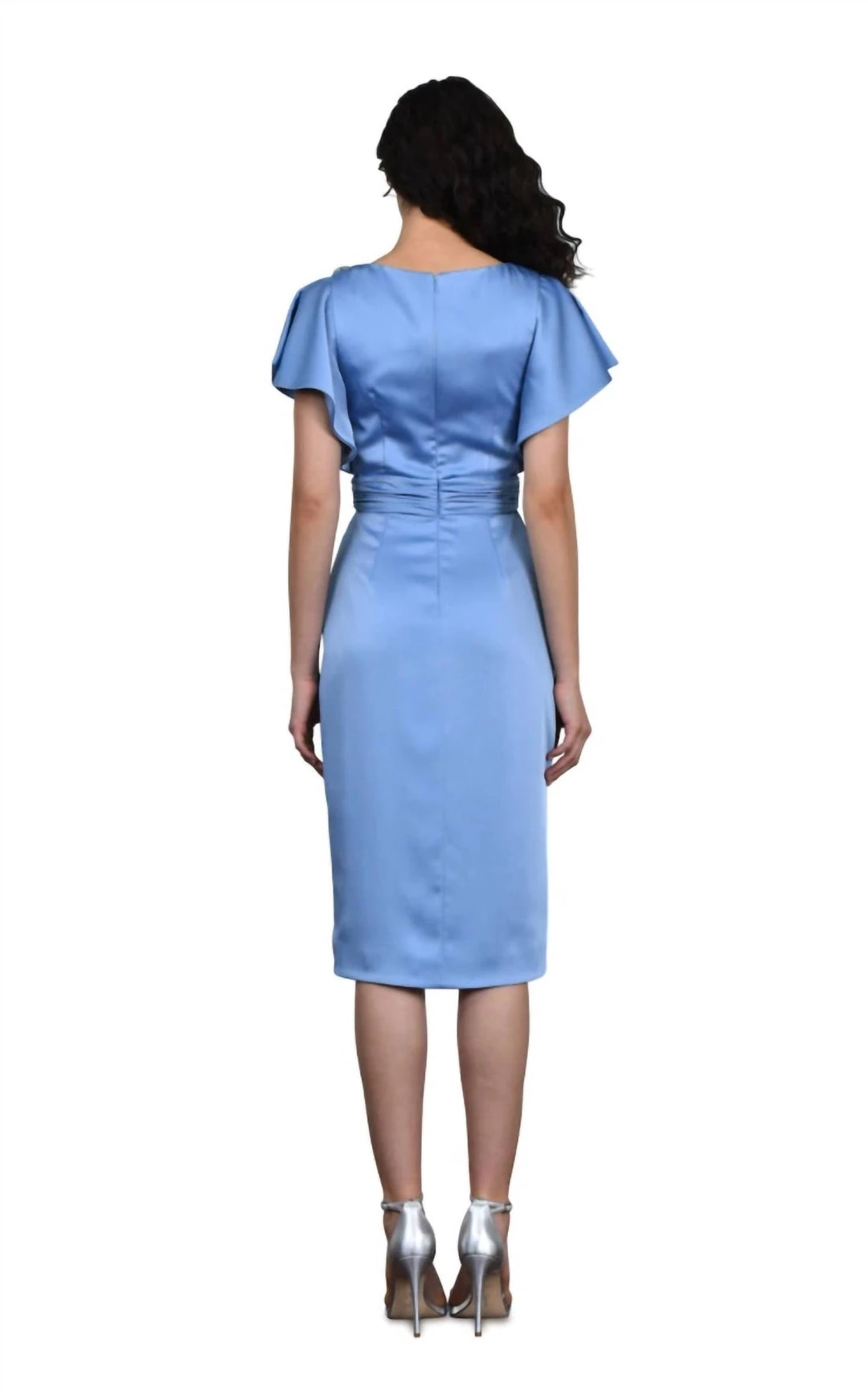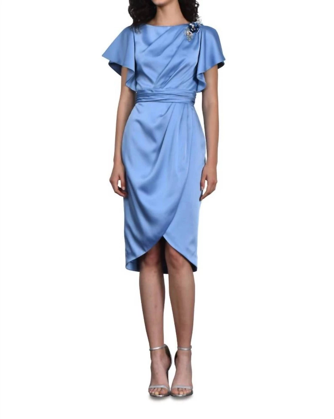 Features asymmetrically draped boat neck bodiceDraped wrap skirtFlutter sleevesZippered back3D floral sequin applique at shoulderColor – DelphiniumFabric and Care – 100% NylonLining – 100% PolyesterProfessional Dry Clean Only
