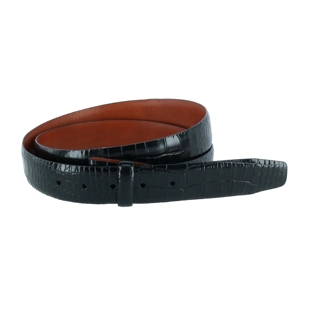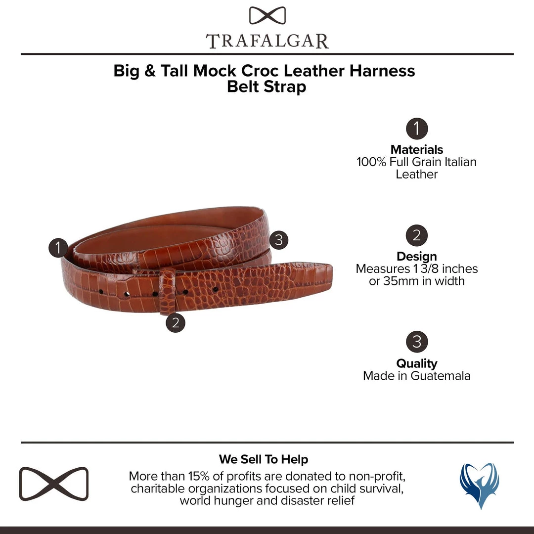 This big and tall leather belt strap will enhance your style and sophistication. The strap features a handsome embossed crocodile design that is rare for a belt. Impress those around you with this exotic print whether you’re wearing jeans, khakis, or dress pants. Pair it with one of Trafalgar’s 1 3/8 inch buckles or one of your own. We recommend ordering your strap one size larger than your waist measurement. For example, if you wear a 52-inch waist pant, please order a 54-inch sized strap.