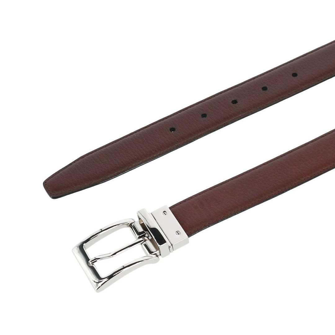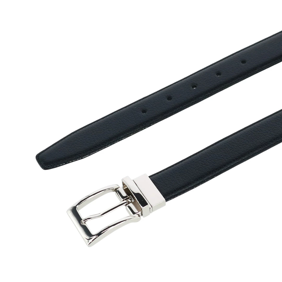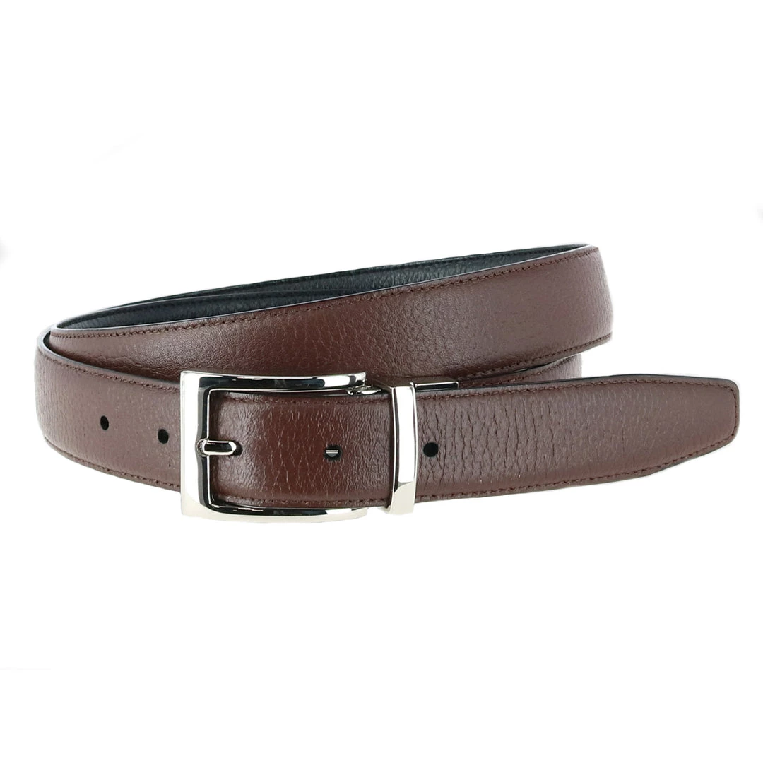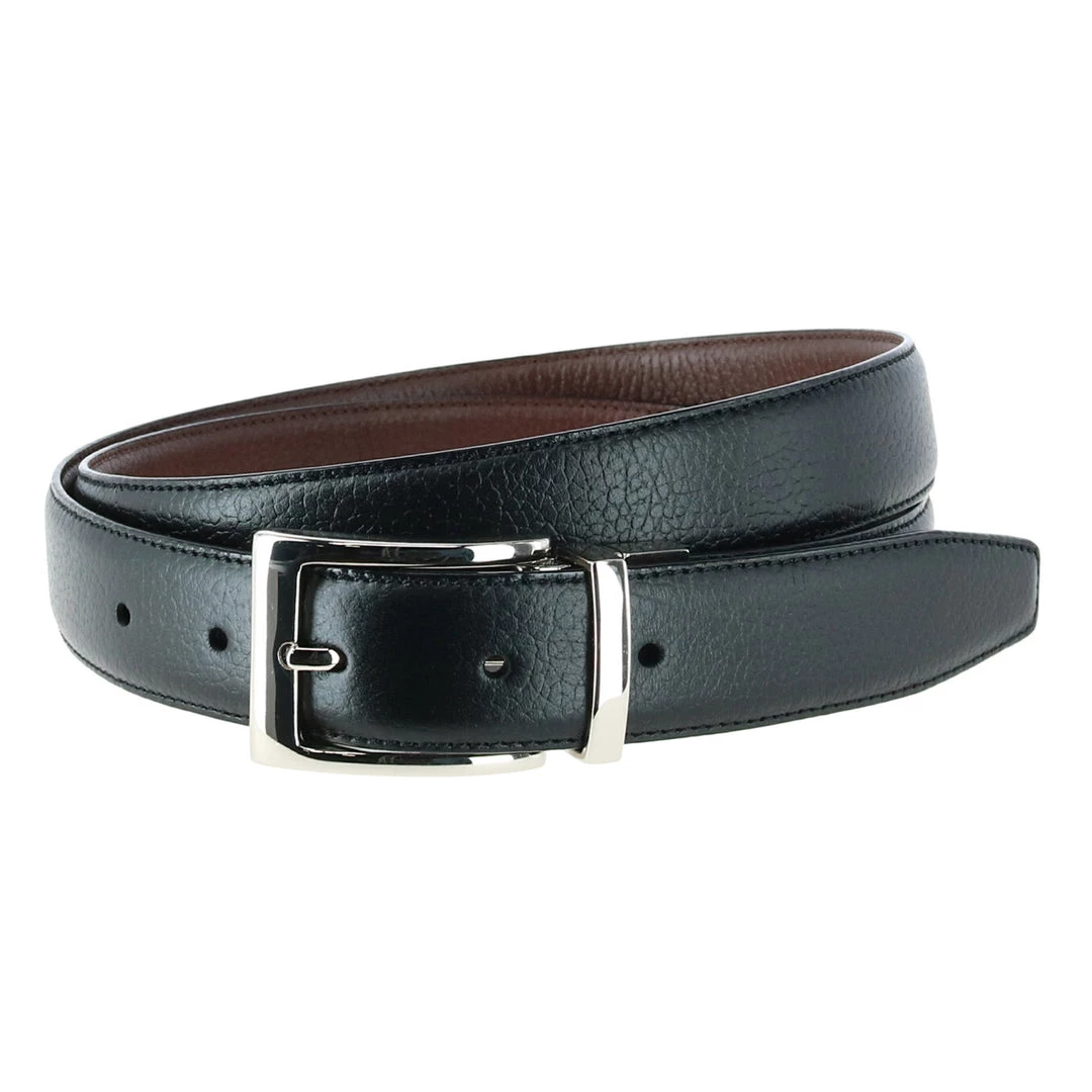 Reversible belts are a classic addition to any gentleman’s wardrobe. The Dorado pebble grain leather belt is reversible from black to brown making it versatile for any occasion. This polished silver buckle completes the look, making it a sophisticated dress belt. This leather belt is imported and elegant for formal or casual wear. When ordering your belt, please order one size larger than your waist, so if you wear a 34-inch waist pant, you should order a 36-inch belt.