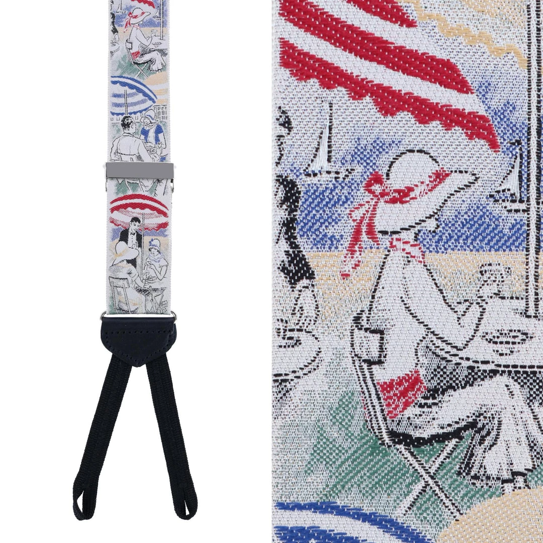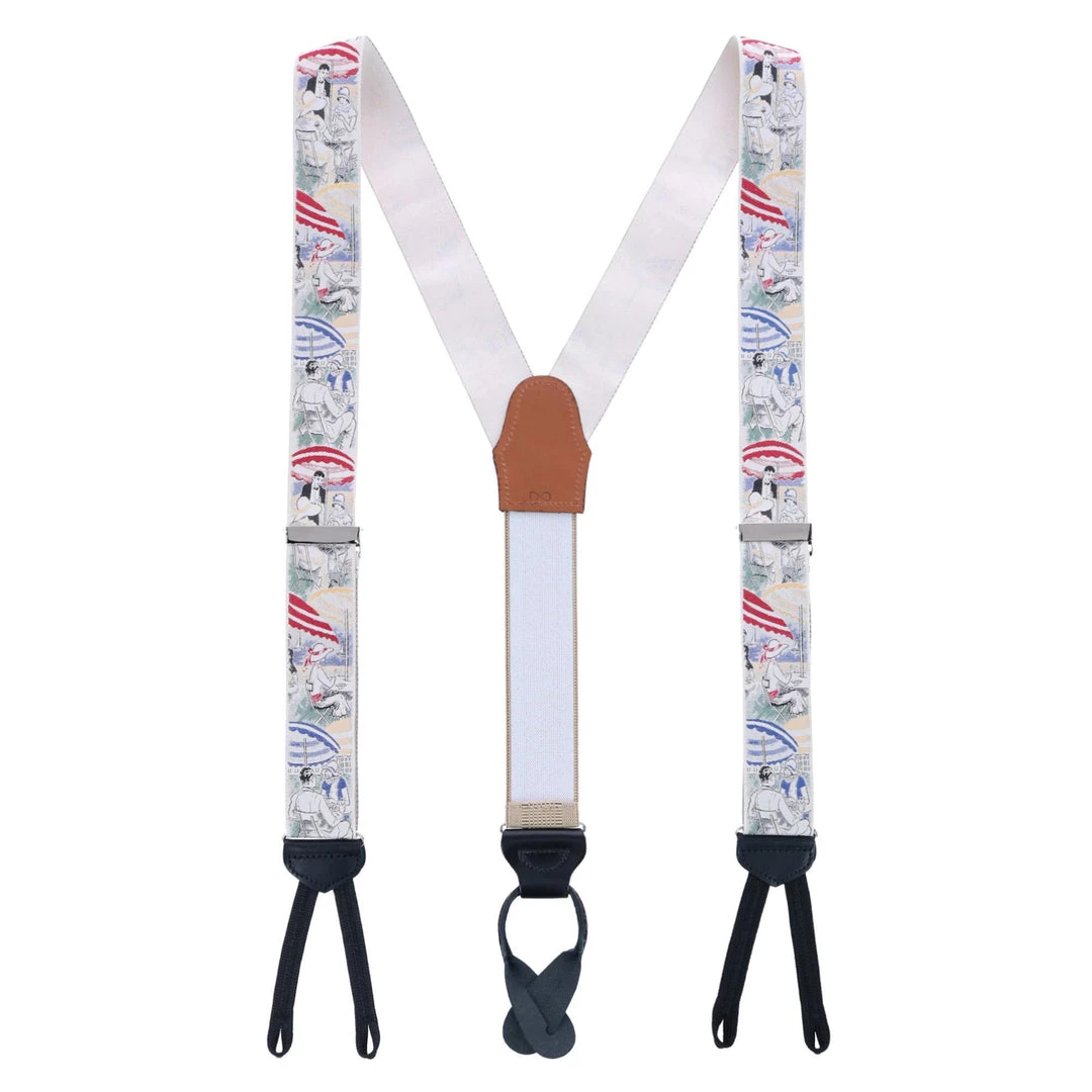 We recently opened the Trafalgar Vault and discovered vintage silk loomed ribbons that were handmade in France and used to create previous designs of our limited edition braces. In our effort to be more sustainable, we decided to create a new brace from the vintage ribbons. Please welcome the Retro Pattern Limited Run Braces! Experience the same beautiful loomed silk ribbons with the same high-quality construction, crafted with a new backing. This way, our limited edition braces remain exclusive, but those who missed previous designs will be able to grab a pair of Retros and enjoy! These braces feature rings and adjusters imported from England to aid you in obtaining the perfect fit. The elastic back strap is a phenomenal way to stay comfortable throughout the entire day. The elastic moves with you, so you almost forget you are wearing the braces. Check back regularly as new Retro styles will be introduced over the year, giving you a chance to pick up designs you may have missed in their initial runs. Made in America.