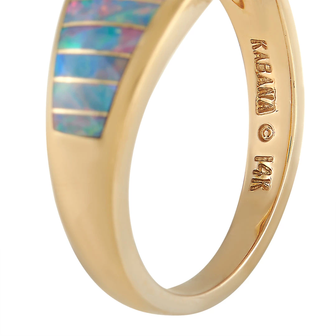 Chic and sophisticated, this Kabana ring will always make a statement. This ring’s creative 14K Yellow Gold setting beautifully showcases precious materials like a 0.75 carat Tanzanite stone, inlaid opal, and diamonds with a total weight of 0.08 carats. It features a 2mm wide band and a top height of 4mm. This jewelry piece is offered in brand new condition and includes a gift box.