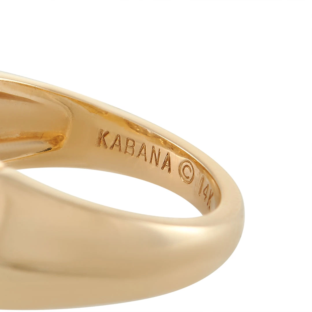 Soft colors and shimmering gemstones make this Kabana ring truly exquisite to behold. At the center, you’ll find a 0.45 carat Topaz gemstone surrounded by inlaid opal and 0.21 carats of glittering diamonds. The 14K Yellow Gold band features a 4mm wide band and a 3mm top height. This jewelry piece is offered in brand new condition and includes a gift box.