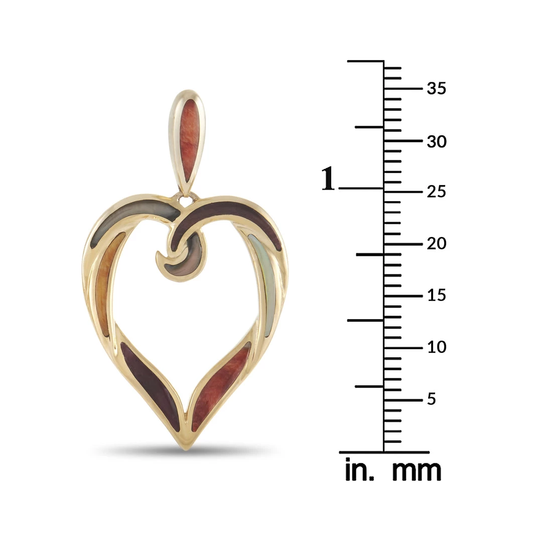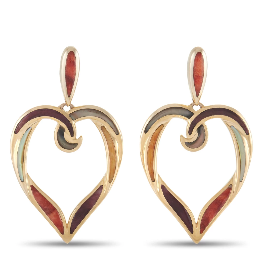 These unique Kabana 14K Yellow Gold Mother of Pearl Spiny Heart Earrings are made with 14K yellow gold in an openwork heart shape. Each earring is inlaid with swirls of Mother of Pearl and Spiny in a range of warm colors. The earrings measure 1.38 inches in length and 0.75 inches in width. Each earring weighs 6.00 grams for a total weight of 12.0 grams.The earrings are presented in brand new condition and include a gift box.