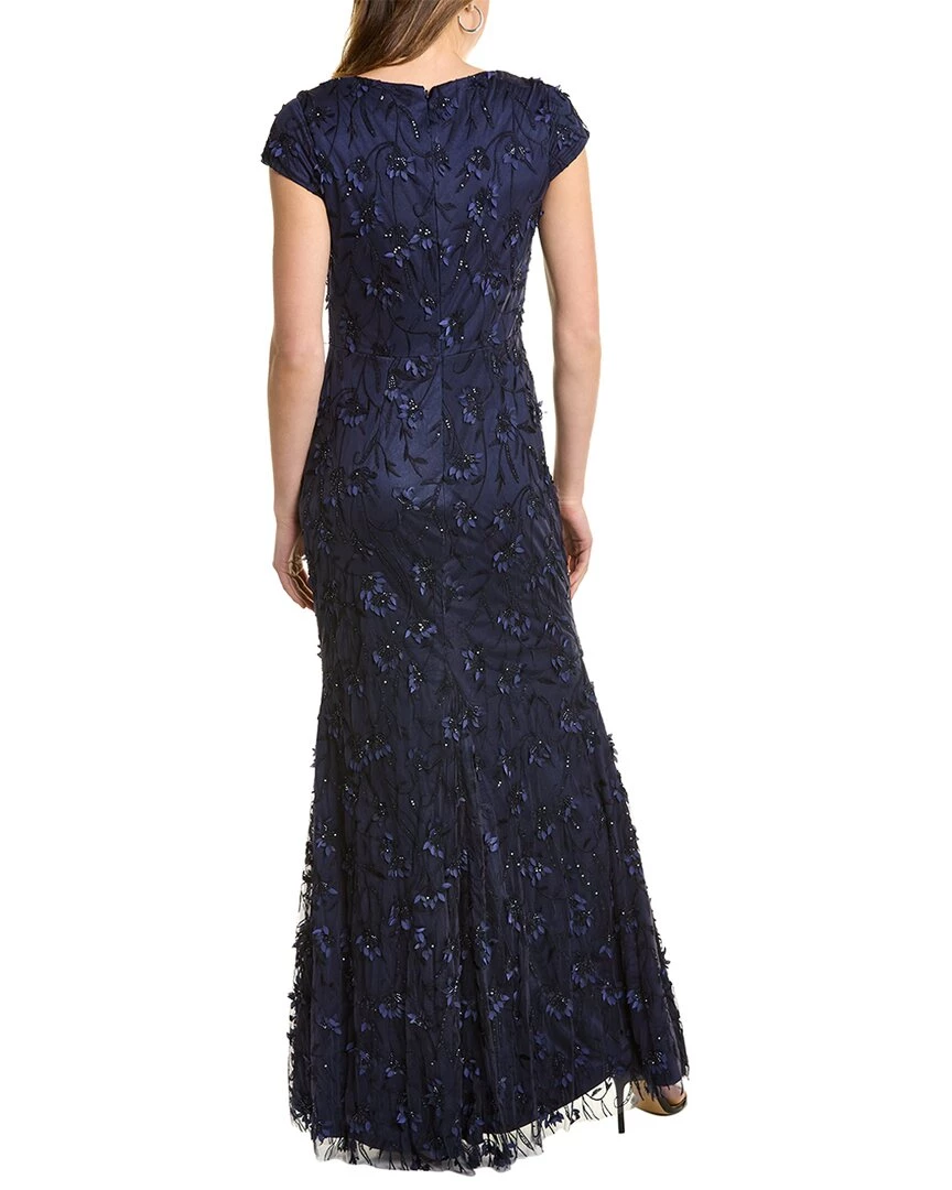 - Beaded Gown In Navy With Sweetheart Neckline And Leaf Applique Design