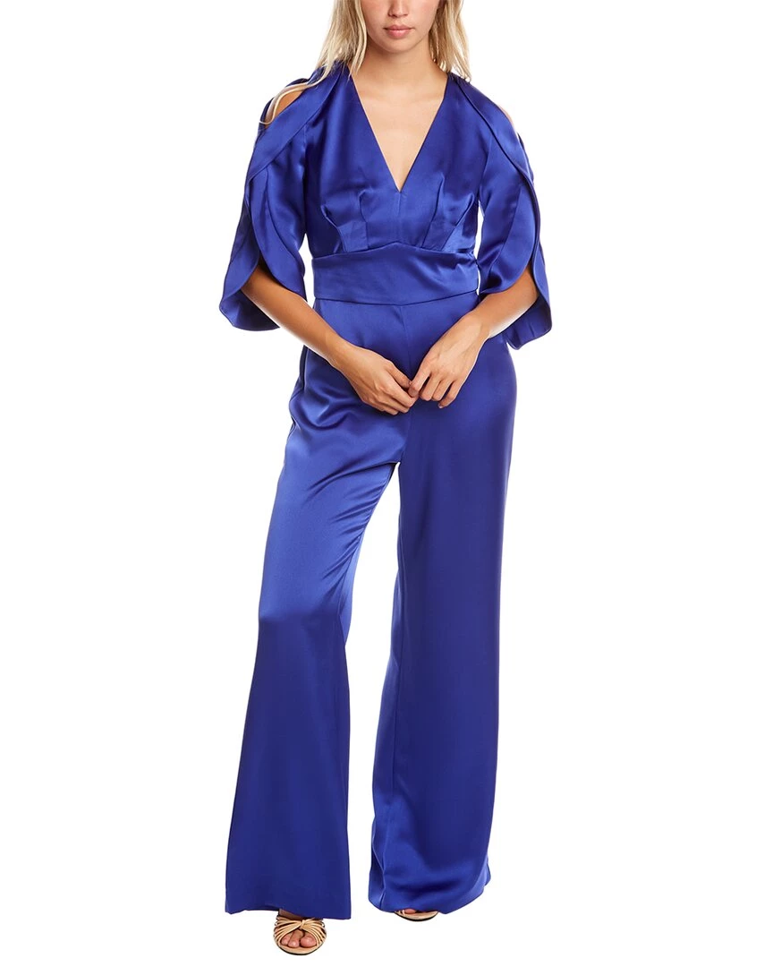 - Janine Jumpsuit In Clematis Blue With Satin Design, Cold-Shoulder Tulip Sleeves, And Pleat Details