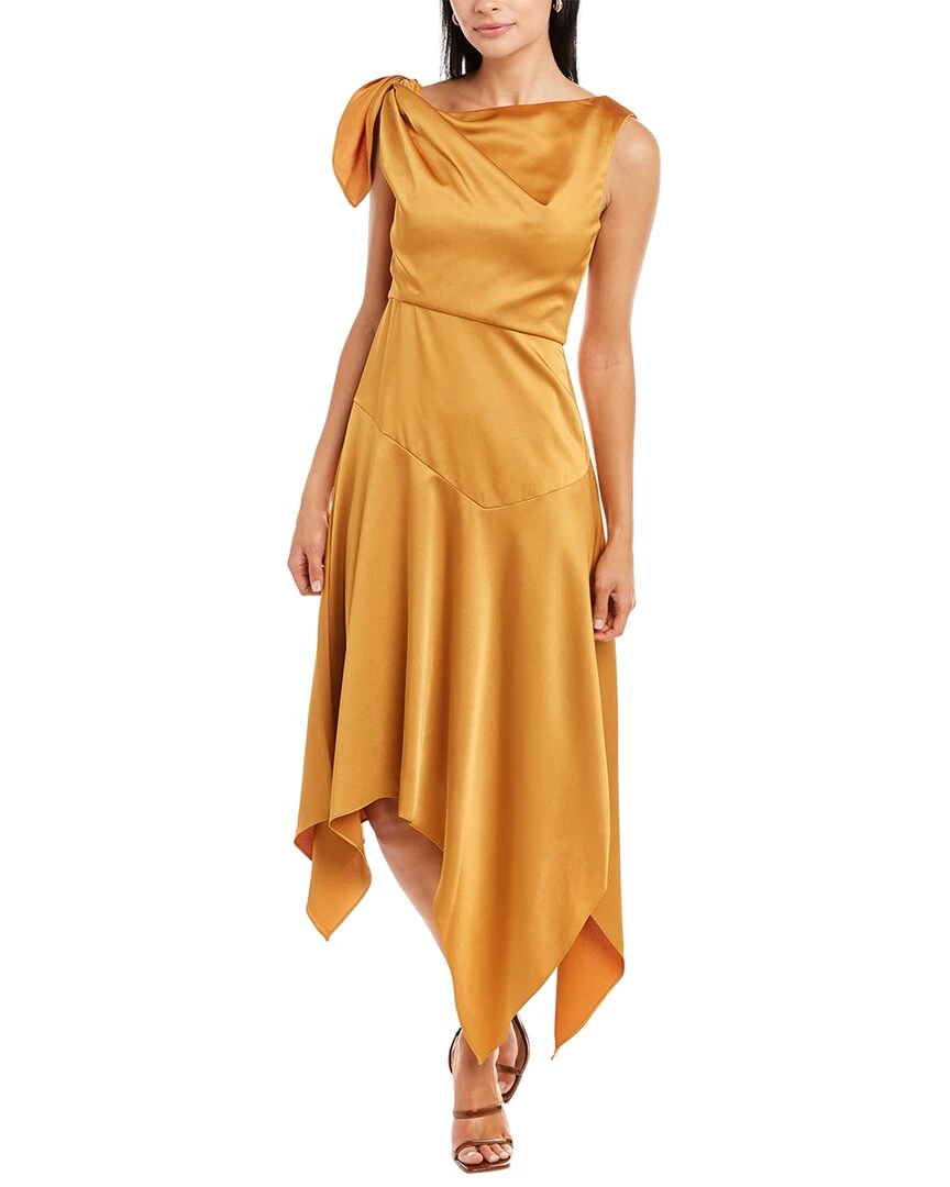 - Larissa Handkerchief Midi Dress In Honey With Asymmetrical Shoulder, Bow Accents, And Tiered Asymmetrical Hem