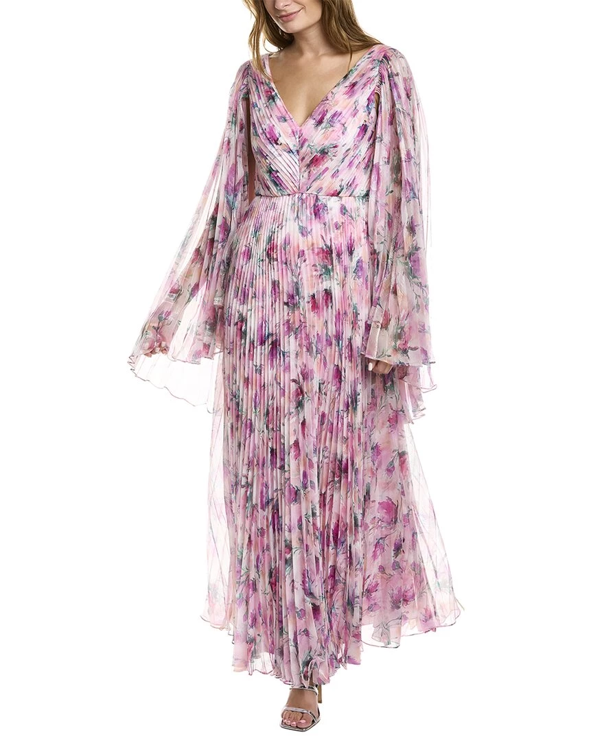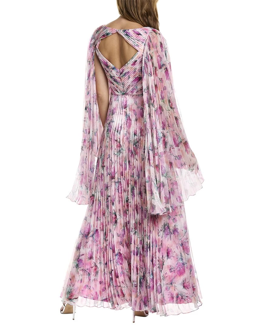 - Melinda Pleated Gown In Floressence With Angel Wing-Cape Sleeves And Back Cutout