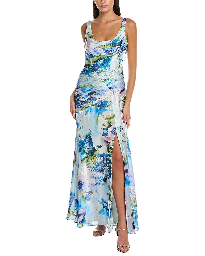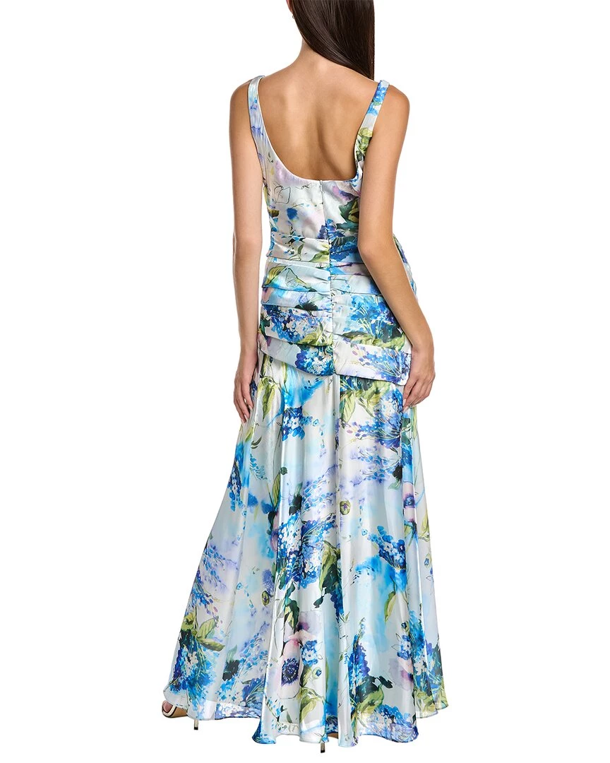 - Mina Draped Liquid Gown In Lilac Bouquet With Satin Design, Pleated Bodice, And Front Slit At Hem