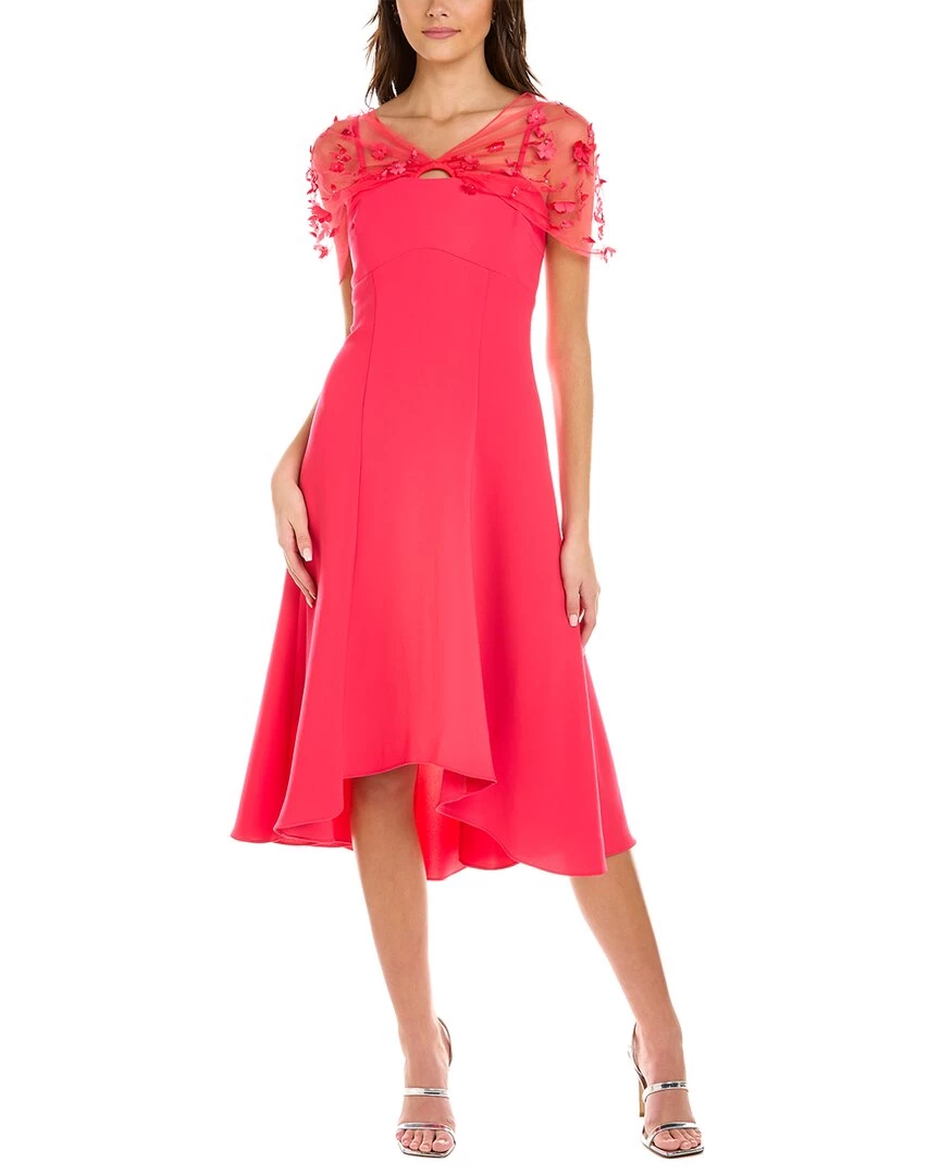 - Riley Cocktail Dress In Hibiscus With V-Neck, Sheer Mesh Shoulders And 3D Floral Appliques, And High-Low Hem